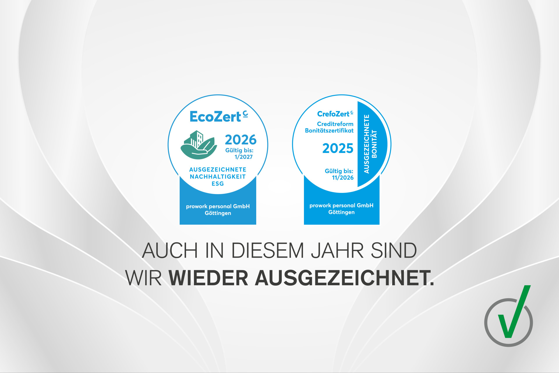 Wir freuen uns sehr über eine besondere Bestätigung unserer täglichen Arbeit: Auch in diesem Jahr wurde prowork personal erneut mit dem EcoZert und dem CrefoZert ausgezeichnet.